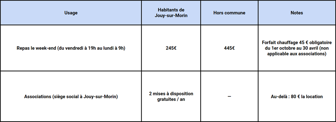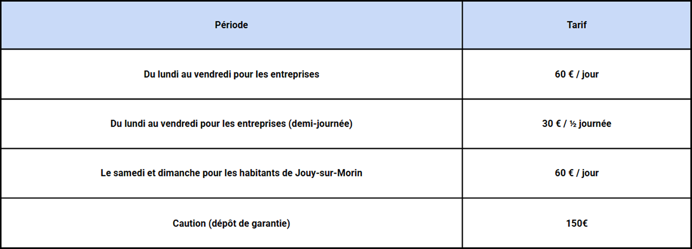 - Caution (dépôt de garantie) : 300€ (restituée après état des lieux et accord du maire ou de son représentant).