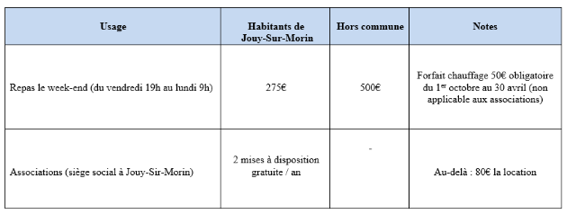 Financier / administratif : - Acompte : 50% du montant de la location à verser à la réservation ; - Annulation : remboursement de l'acompte si l'annulation intervient au plus tard 2 mois avant la date de la location ; au-delà, aucun remboursement ; - Caution (dépôt de garantie) : 300€ (restituée après état des lieux et accord du maire ou de son représentant).