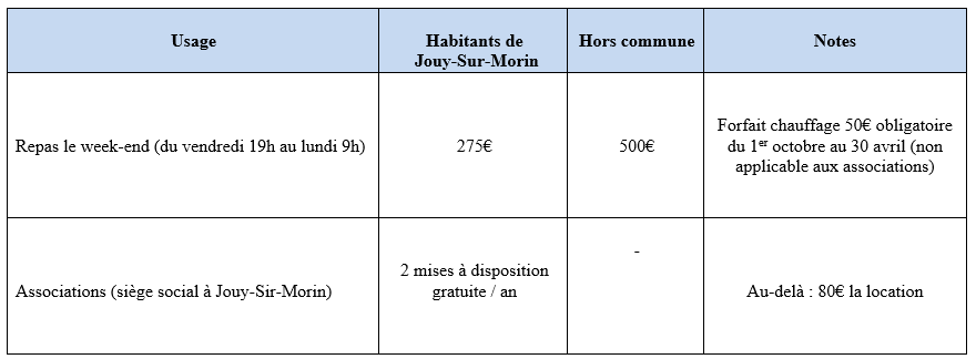 Le matériel suivant est également disponible à location : - Table, 2m20x0m67 : 5€ l'unité ; - Banc : 2€50 l'unité ; - Parasol : 20€ l'unité ; - Chaise : 0,50€ l'unité. Pour toute location de matériel, une caution d'un montant 150€ doit être versée.