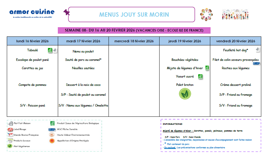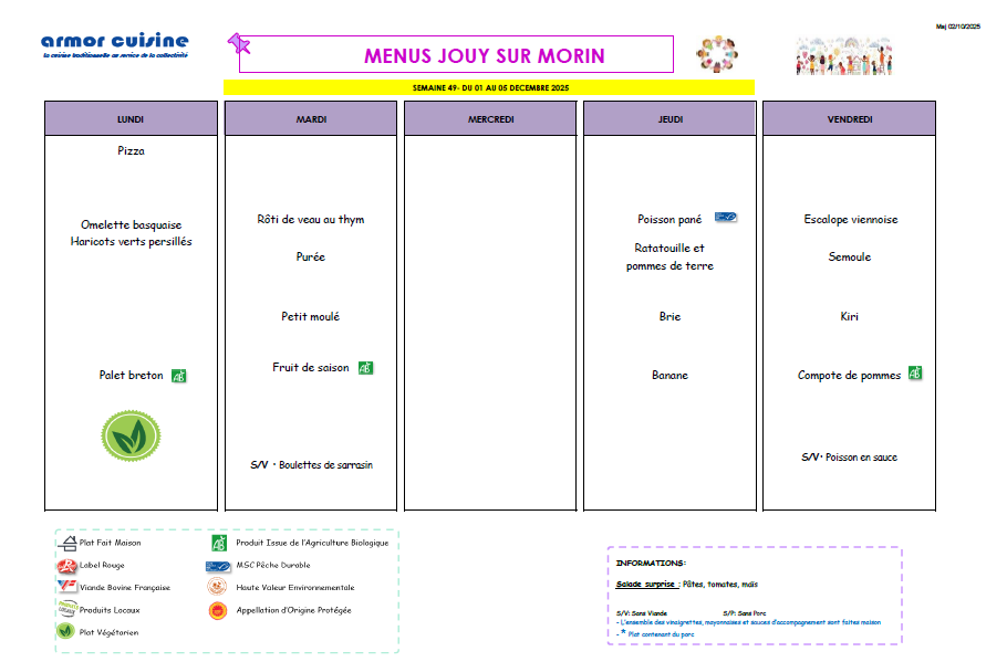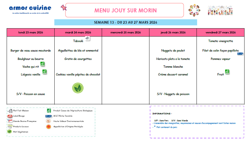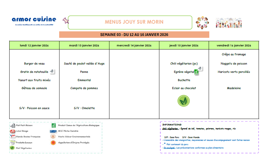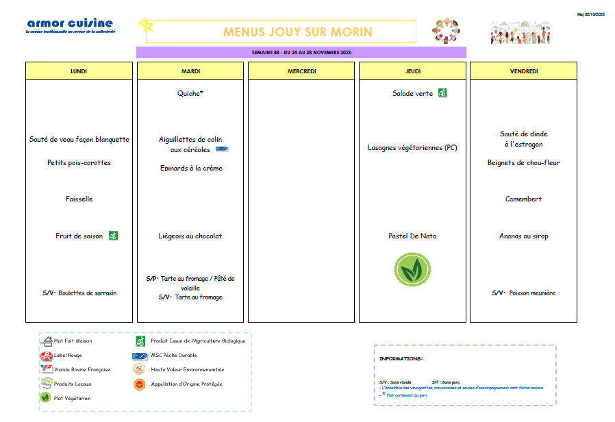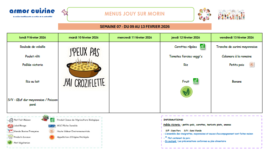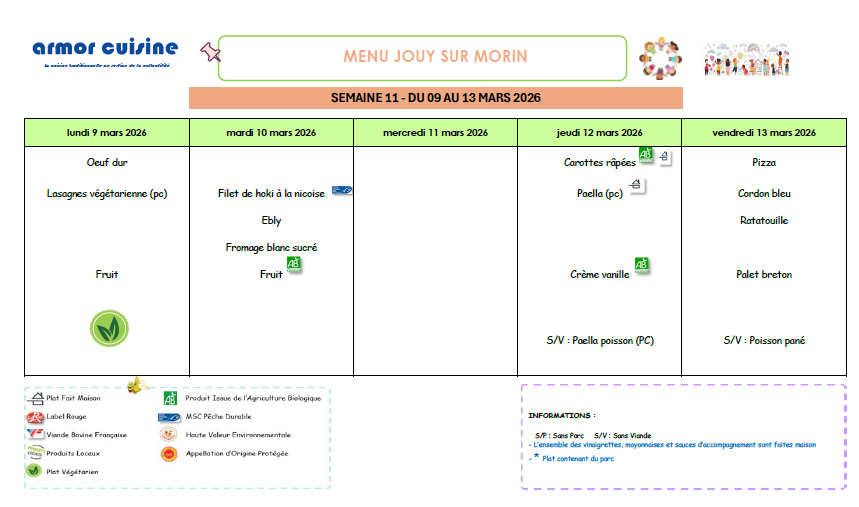 Le prix de facturation du repas servi à la restauration scolaire est fixé à 4,85€ par enfant et 5,90€ par adulte pouvant bénéficier de ce service. Le montant de la participation financière demandée aux familles dont les enfants bénéficient d'un Projet d'Accueil Individualisé est fixé à 1,70€. Vous trouvez les menus de la cantine ci-dessous :