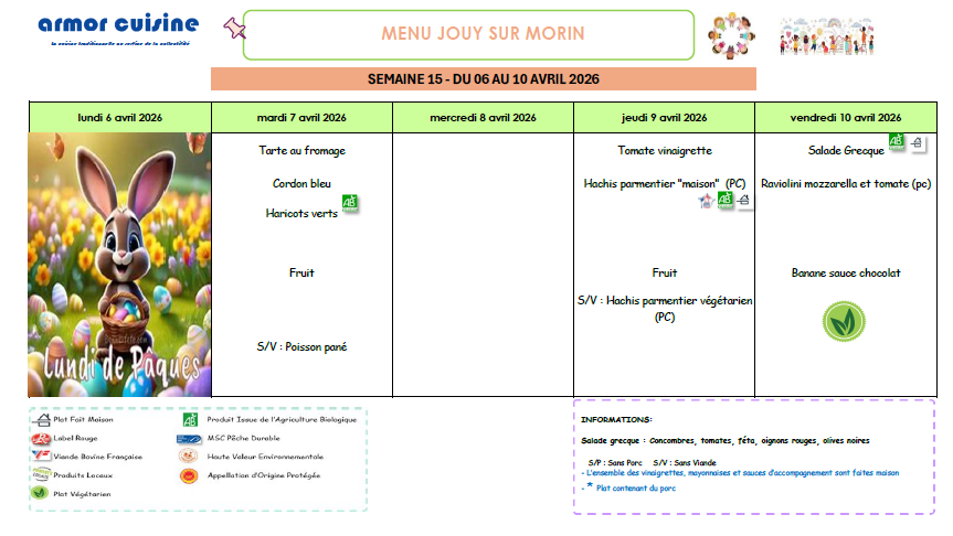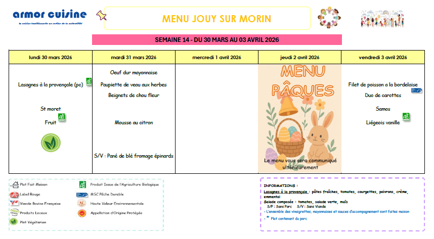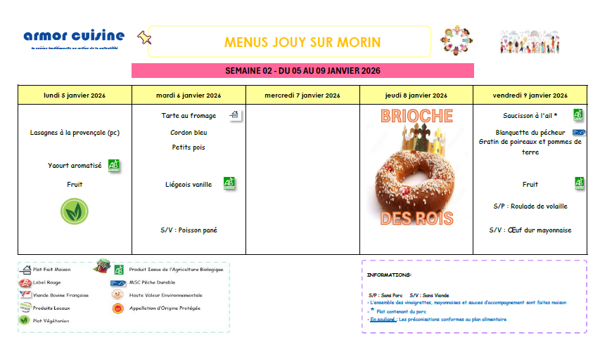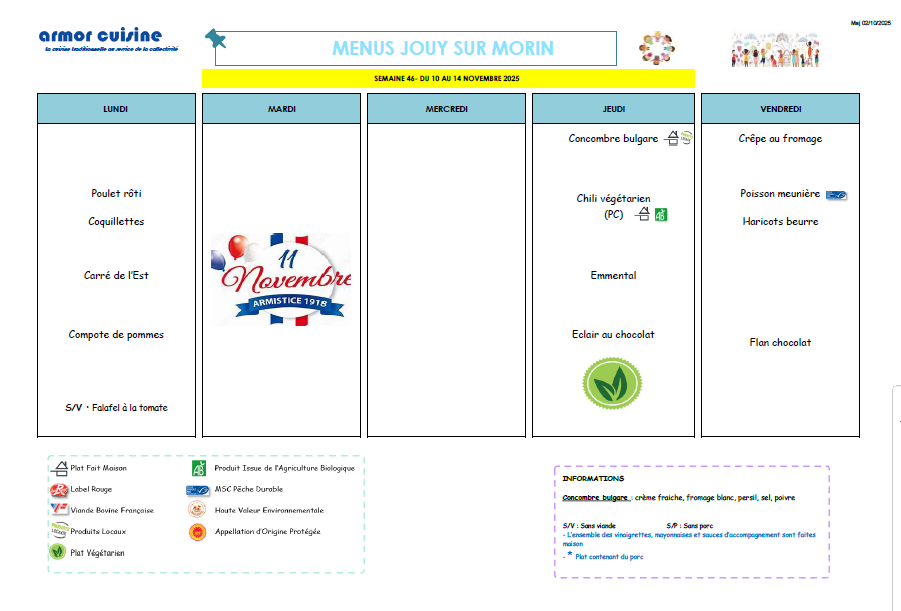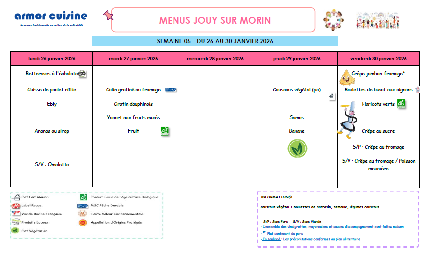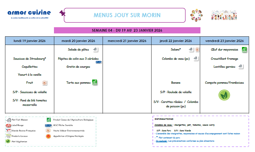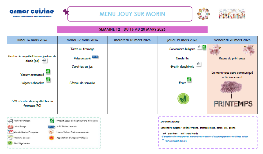 Le prix de facturation du repas servi à la restauration scolaire est fixé à 4,85€ par enfant et 5,90€ par adulte pouvant bénéficier de ce service. Le montant de la participation financière demandée aux familles dont les enfants bénéficient d'un Projet d'Accueil Individualisé est fixé à 1,70€. Vous trouvez les menus de la cantine ci-dessous :